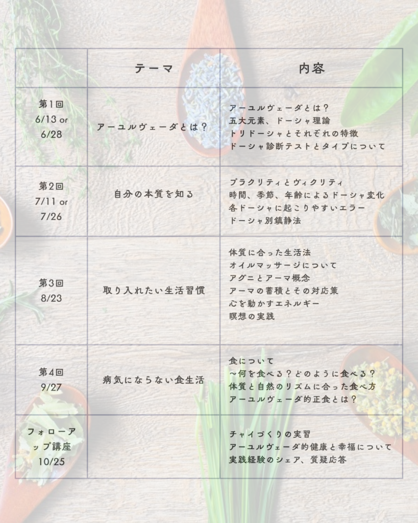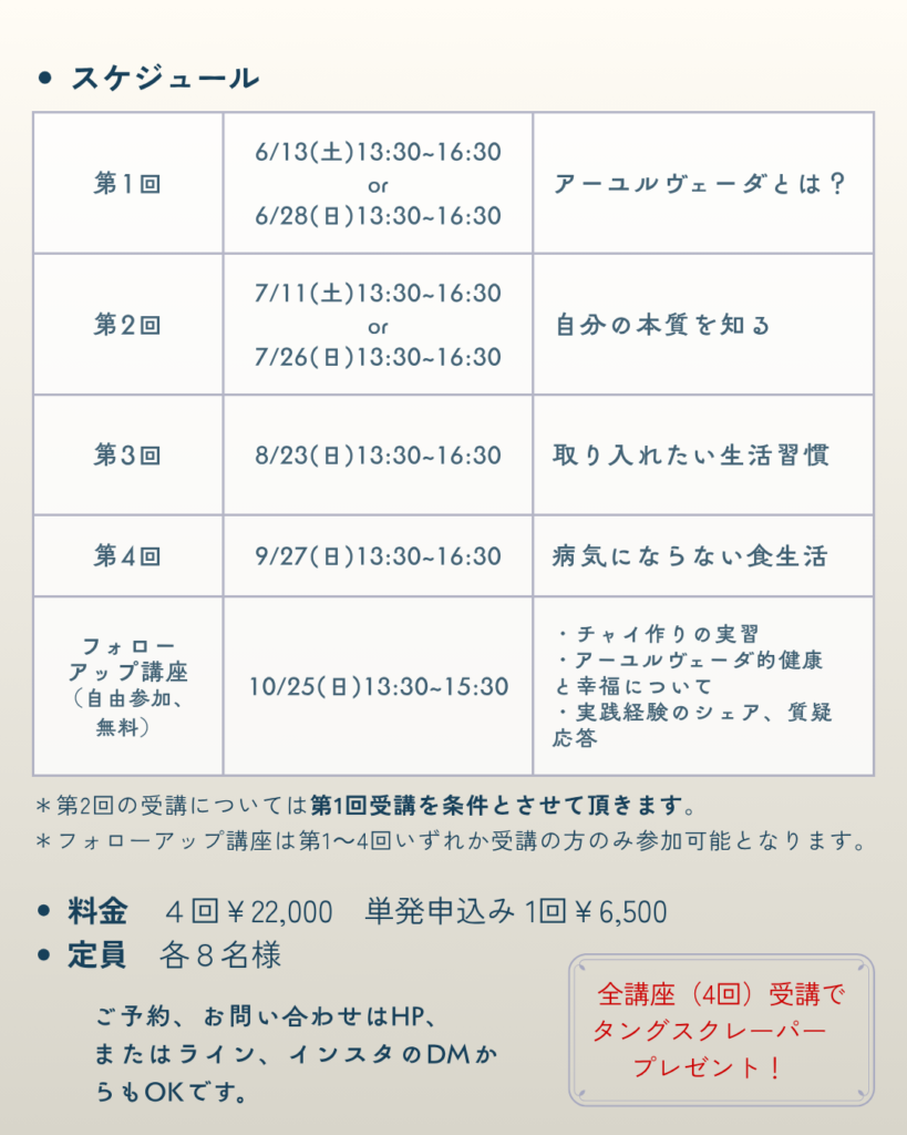 ぜひアーユルヴェーダの扉を開いてみて下さい。今回はお伝えしたいことをあまり省略したくないので複数回に分けて講座を設定させて頂きました。全て受けてもらいたいなあというのが本音です。
